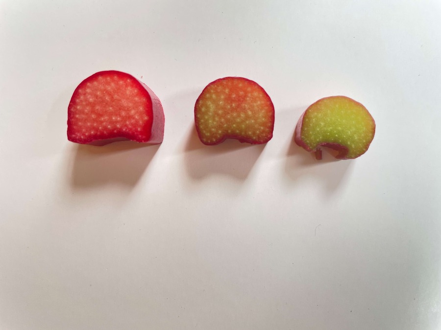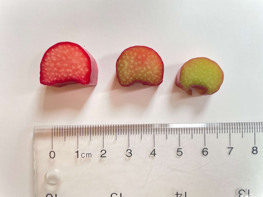 Pétioles verts, semblables à Victoria mais légèrement plus vigoureux et de couleur plus intense, généralement avec une moucheture rose plus foncée sur une tige verte. Très forte tiges approprié pour jus et la vinification.