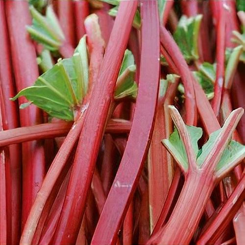 An herbaceous perennial with uniformly tall leaves from ground-level. The green leaves are supported by red stems which are reported to be less acidic than some varieties