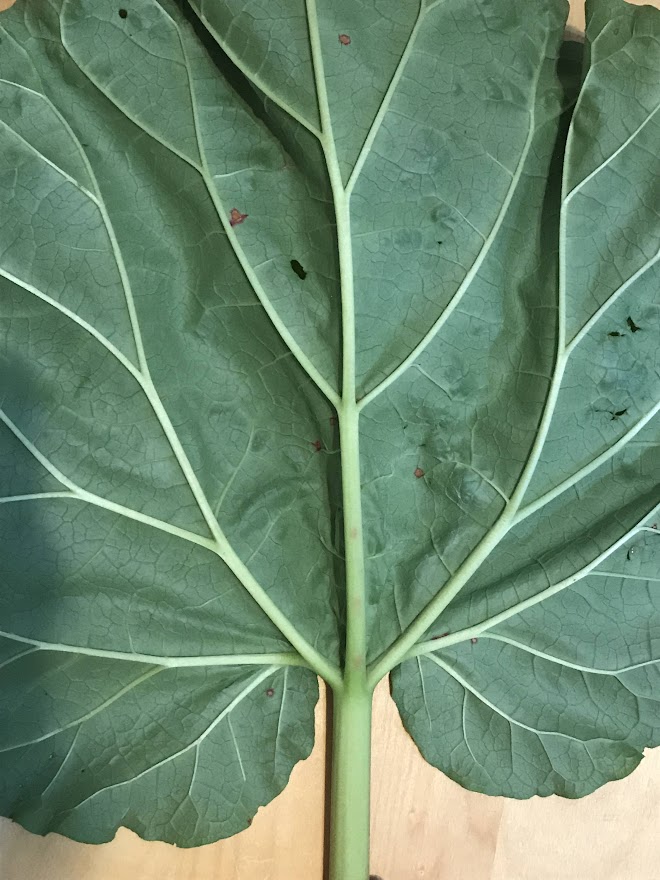 Tiges de bonne grosseur, juteuses; peau rouge foncé, fine ; chair rosée. La saveur et les fibres des tiges sont excellentes et une fois cuites, le produit est d'une jolie couleur rose. Sa cuisson nécessite moins de sucre que toutes les variétés anciennes. Envoie des tiges de graines mais semble produire seulement peu de graines. Les tiges ont une face légèrement en forme de V et le dos est arrondi et nettement canalisé. Les feuilles sont grandes, cordées et plus larges que longues, légèrement arrondies et sans pointe. Les feuilles sont savoyées et ondulées sur les bords.