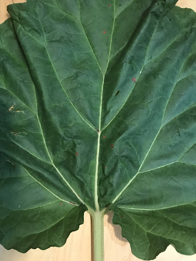 "Seedling of Victoria rhubarb, selected for its rich red color. both on the exterior of the stalk and in the interior, and for its earliness and productiveness. The stalks are broad and thick averaging 1" across by 3/4 thick. The stalks have a slightly V Shaped face and the back is rounded and decidedly channelled. The leaves are large, cordate and broader than long, slightly roundish and without a point. The leaves are savoyed and are wavy at the edges. The average measurements of the leaf and stalk from young strong plants are as follows: diameter of leaf 21"; color (Ridgways Color Standards), base of stalk, rose red, stalk, carmine to garnet brown ranging to pompeian red towards the leaf and shading of 1/3 to 2/5 up the large veins of the leaf blade. The internal color of the base of the stalk (sliced stalk), is a pale rose red with white veins, in the centre of the stalk are rose red patches on a geranium Pink ground. The expressed juice stains white paper a deep rose Pink when wet, and in drying changes to a rose Pink or amaranth Pink. The foliage is softly or minutely covered with very fine hairs, and in color compares with Varleys Green".