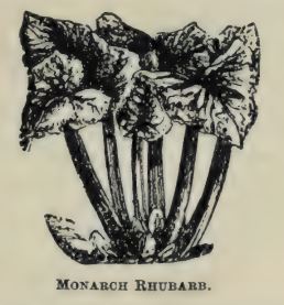 1901 — Monarch — A Boston seedsman introduced a Scotch importation of rhubarb about fifteen years ago under the name of Monarch. For several years it was awarded first prize at the exhibitions of the Mass. Horticultural Society, as the largest and finest variety. On one occasion the twelve stalk shown weighed '28 pounds, leaves off.