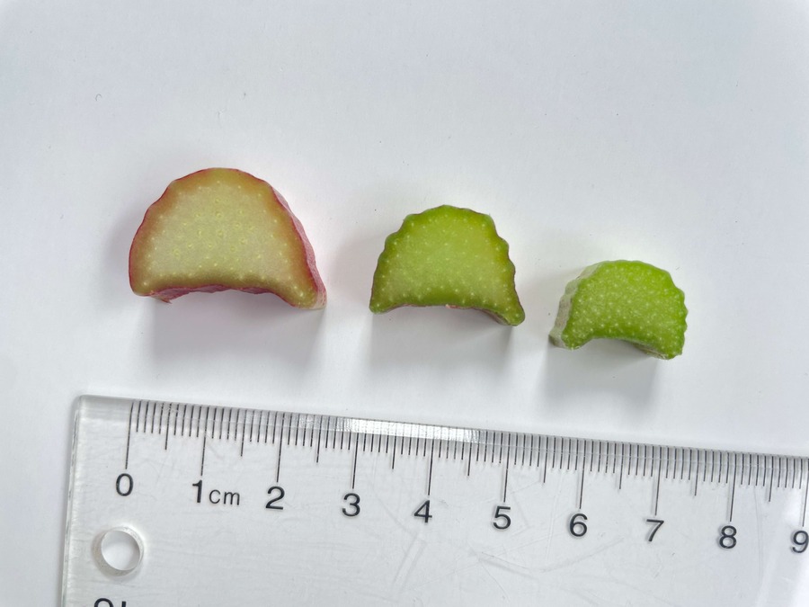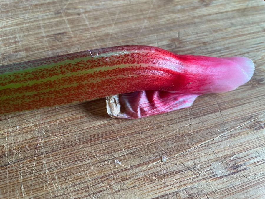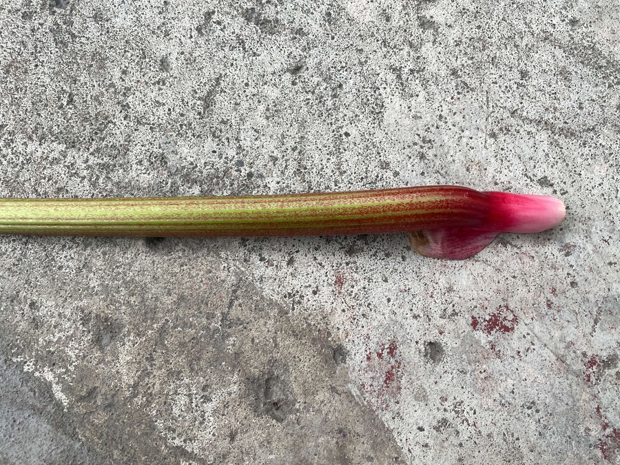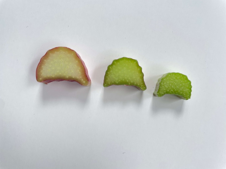 Les tiges, plutôt fines par rapport aux autres variétés de rhubarbe, ont des nervures prononcées à l'arrière et des rainures profondes à l'intérieur. La chair est verte à rose, parfois rouge dans la partie inférieure de la tige. La couleur rouge est due à une teneur élevée en anthocyanes, en particulier en cyanidine-3-rutinoside et en cyanidine-3-glucoside.