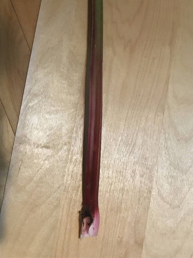 Tiges de bonne grosseur, juteuses; peau rouge foncé, fine ; chair rosée. La saveur et les fibres des tiges sont excellentes et une fois cuites, le produit est d'une jolie couleur rose. Sa cuisson nécessite moins de sucre que toutes les variétés anciennes. Envoie des tiges de graines mais semble produire seulement peu de graines. Les tiges ont une face légèrement en forme de V et le dos est arrondi et nettement canalisé. Les feuilles sont grandes, cordées et plus larges que longues, légèrement arrondies et sans pointe. Les feuilles sont savoyées et ondulées sur les bords.
