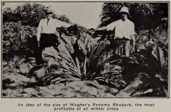 1928 — Wagner’s Panama Rhubarb. We offer herewith the best rhubarb it is possible to grow. We have experimented with rhubarb for twenty-five years and are responsible for ever)' named variety of Winter Rhubarb that is now offered to the public, of which Wagner’s Panama is supreme. It produces as high as twenty tons per acre and very strongly resembles the strawberry rhubarb, but, unlike the strawberry variety, it produces over the entire year and is at its best during February and March when prices of $2.00 per box of 30 pounds is obtainable.