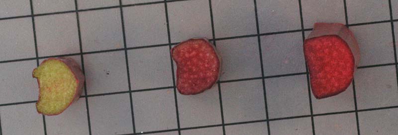 1939 — Ruby: Originated at Central Experimental Farm, Ottawa. Has a smaller stalk than Macdonald but the stalks are more numerous. About two-thirds of the length of the stalk, the skin is a ruby red color and about two-thirds of the flesh is of the same rich color and of fine grain. The red color is due to a speckling of small red dots which are most numerous at the base of the stem, gradually thinning out towards the top. Ruby can be distinguished from Macdonald by this character. Ruby is of slightly better flavor than Macdonald and slightly less acid requiring a little less sugar for cooking. Produces a quantity of seed. A fairly high percentage of the seedlings are of a good type. Possibly more subject to a crown rot than is Macdonald.