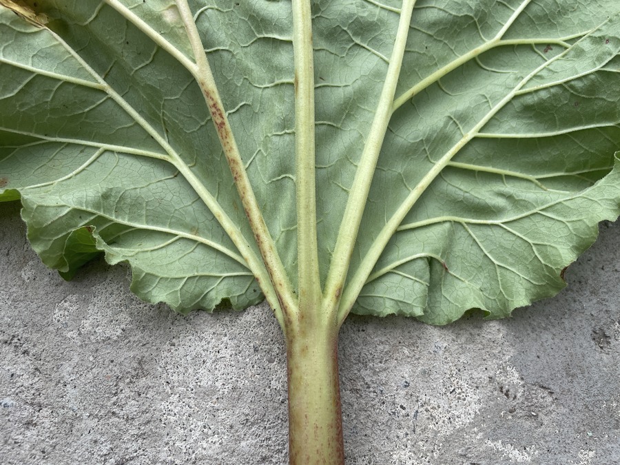 Cette plante vivace vigoureuse et dressée a de grandes feuilles triangulaires vert foncé ridées et produit de longues tiges rouges pâles ou vertes rouges et parfois en été de grandes fleurs dressées.